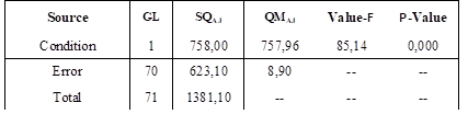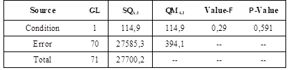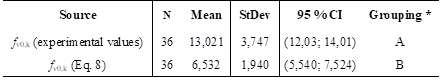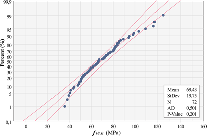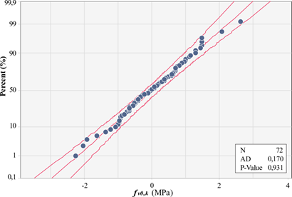It can be seen that the compared groups of values - fv0,k (experimental values) and fv0,k (Equation 8) - are not equivalent (P-Value=0,00, Table 5), indicating an inaccuracy of Equation 8 of the ABNT NBR 7190 (1997). Figure 4 confirms the results of ANOVA for a normal distribution of data and P-Value=0,931.