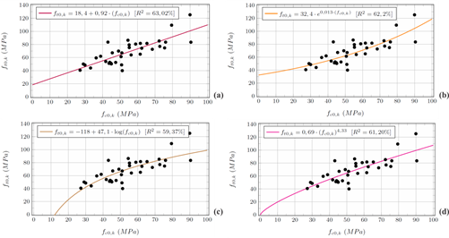 (8)These equations were used to determine the mechanical properties in this work. The simplification found in these equations may (or may not) be consistent with the actual results of the experiments; therefore, this work sought to evaluate the applicability of regression models for estimation of the mechanical parameters (ft0,k and fv0,k from fc0,k).