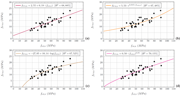 The obtained characteristic values (Equation 4) can then be used to assess the expressions defined in the Brazilian standard for a simplified characterization of the wood basing on the compressive strength in the direction parallel to the grain (fc0). The Standard provides some relations, in particular Equation 7 and Equation 8, which allow obtaining the strength characteristics ft0,k and fv0,k from fc0,k: