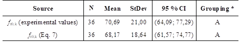 ANOVA was used to compare the 36 experimentally obtained results of ft0,k and fv0,k (Table 1, experimental values) to ft0,k and fv0,k values calculated from experimental fc0,k values (Table 1, experimental values) using the Equation 7 and Equation 8 (Table 1, estimated values).