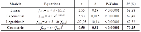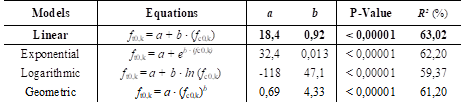 (15)The evaluation of the expressions proposed by the Brazilian standard (Equations 7 and Equation 8), therefore, can be alternatively done using the regression functions (Equations 7, Equation 8, Equation 9 and Equation 10). The coefficient α (Equation 15), together with the ANOVA, the normality test and the Tukey Method, can be used to validate the relationships given in the NBR.