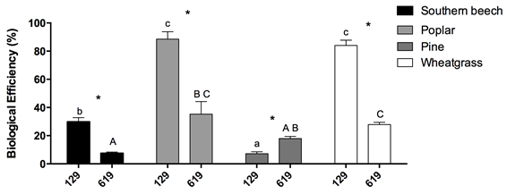 The commercial strain of Pleurotus ostreatus CIEFAPcc 129 was more productive than CIEFAPcc 619 native strain in white poplar, wheatgrass, and southern beech substrates (p<0,05). Biological efficiency was over 80 % with poplar (88,5 % ± 12,9 %) and with wheatgrass (84,01 % ± 9,32 %), and close to 30 % with southern beech (29,92 % ± 6,96 %), while the native strain produced BE close to 40 % in white poplar (35,28 % ± 21,9 %) and in wheatgrass (27,84 % ± 3,98 %) and close to 10 % in southern beech (7,56 % ± 2,05 %) (Figure 1).