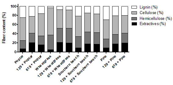 The proportional of lignin, cellulose and hemicellulose was lower after degradation by both strains in white poplar, while in southern beech and pine the degradation was greater on lignin. In wheatgrass, the degradation was mainly on cellulose. In all substrates, the percentage of extractives (gums, tannins, resins and latexes among others) increased after fungal degradation (Figure 2).