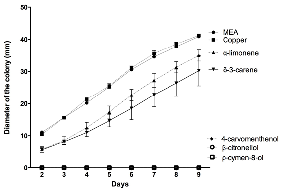 The diameter of the fungal colony was negatively affected by the addition of resin volatiles. The treatment with copper (CuSO4, 41,25 mm ± 0,5 mm) in the evaluated concentration did not show differences with the MEA medium control (40,91 mm ± 0,14 mm) after 9 days. However, it was lower in treatments with α-limonene (35,00 mm ± 3,04 mm) and δ-3-carene (30,25 mm ± 6,72 mm); and null with 4-carvomenthenol, β-citronellol and ρ-cymen-8-ol (Figure 3).