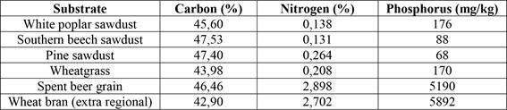The values for carbon, nitrogen and phosphorus of different local agricultural and forest waste by-products are shown in Table 1. The C, N and P values were similar between the wastes of beer production (spent beer grain) and the industrial wheat bran (traditionally used as supplement), indicating that this residue is an economic alternative for the formulation of substrates, contributing N and P principally (Table 1). In the case of base substrate, C content was similar in all materials, the N content was higher in pine sawdust (0,264 %) and wheatgrass (0,208 %) in comparison with poplar (0,138 %) and southern beech sawdust (0,131 %); whereas P was higher in wheatgrass and poplar content.