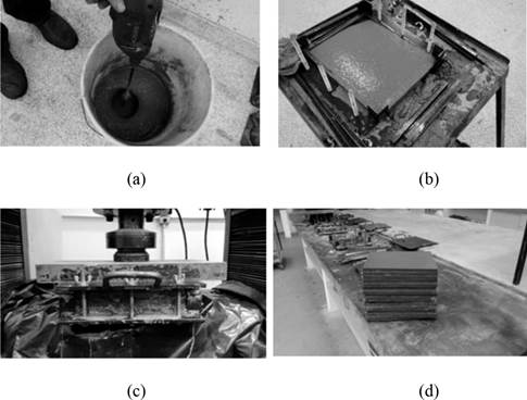 The boards were produced through cold compression, with specific pressure of 40 kgf/cm², and their dimensions were 270 mm x 220 mm x 12,5 mm. They were superimposed in groups of 4 boards and kept nailed for 24 hours (initial curing) (Figure 1b and Figure 1c). For the compression molding, the universal test machine Emic (Instron Brasil), model DL 30000, was used. After this period, demolding was performed (Figure 1d) by removing the fixation nails, and the boards were stored in a humidity chamber at the temperature of 23 ± 2ºC and relative humidity of 95% or higher. After curing for 28 and 91 days, the boards were sawed to produce the test specimens; the dimensions were in accordance with the ASTM D 1037 (2012) standard.