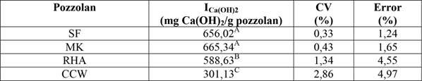 Based on the pozzolan analyses by the Chapelle method, the fixed Ca(OH)2 contents were determined, as presented in Table 1. According to the Chapelle test values, the minimum and sufficient pozzolan contents were determined for the sufficient minimum amount to assimilate the 27,39% of Ca(OH)2 produced in the cement hydration. The values obtained were: 29,45% for SF replacement; 29,16% for MK; 31,76% for RHA; and 47,63% for CCW. In order to facilitate the research, rounded figures were adopted (30% for SF and MK; 35% for RHA; and 50% for CCW).