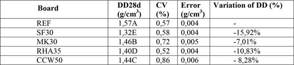 Table 2 shows the dry density of the boards produced. Values obtained for all boards in the dry state were higher than 1 g/cm3, as recommended by the BSI BS EN 323 (1993) standard. Densities of the boards produced with Portland cement replacements were significantly lower than those of the reference boards, with reductions of around 7,01% (MK30) to 15,92% (SF30).
