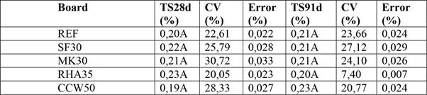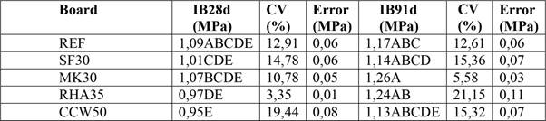 Table 5 show the values established for the perpendicular tensile strength (internal bond - IB) of the prototype boards.