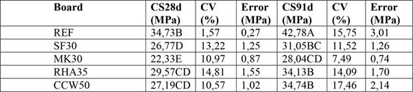 By analyzing the values shown in Table 4, it can be concluded that the boards produced with the replacement of Portland cement by pozzolans presented lower results compared to those determined for the reference boards (34,73 MPa at 28 days and 42,78 MPa at 91 days of curing). This phenomenon was not expected, since pozzolans should assimilate all Ca(OH)2 from the cementitious matrices, transform it into C-S-H and keep the resistance values at the same levels as the reference boards, especially at 91 days of curing. Even so, the determined CS values are well above the 18,13 MPa found by Matoski et al. (2013) or 10,37 MPa, determined by Bertolini et al. (2014), and higher than those determined by Garcez et al. (2016), which presented CS values between 4,16 MPa to 7,35 MPa for composites produced with P. elliotti.