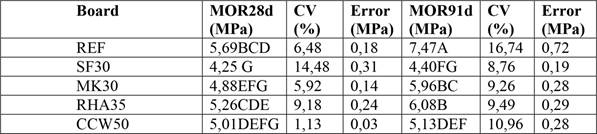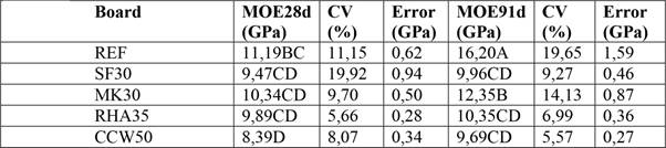 At 28 days of curing, no significant differences were observed between the reference boards and those with pozzolans, except for the boards produced with 50% of CCW. At 91 days of curing, the MOE evolution for the boards produced with pozzolans was lower than the evolution observed for the reference boards, which provides significant statistical differences within the prototypes at this age.