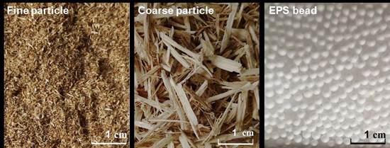 Poplar (Populusspp.) particles (air-dried moisture content of about 8 %) were provided by Ningfeng Wood-based Panels Corporation, China. The particles were sievedto obtain fine (<1 mm) and coarse (1mm to 4 mm) fractions for use, as shown in Figure 1. EPS beads with a spherical shape (average diameter of 2,2 mm, density of 50 kg/m3 to 60 kg/m3) were used as light fillers. A polymethylene isocyanate (pMDI) resin (WANNATE®PM-200, viscosity of 150~200 mPa·s at 25 °C, NCO content of 30~32 wt%), was obtained from the Wanhua Chemical Corporation, Beijing, China. Acetone was used as resin diluent for better adhesive distribution.
