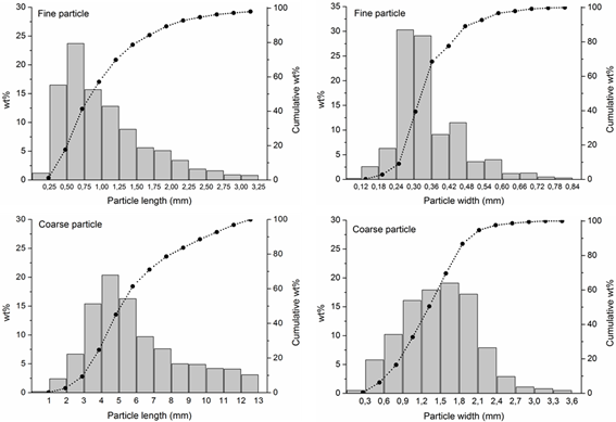 The particle size (length and width) distributions are displayed in Figure 2. Coarse particle sample had largeraverage lengthand width than fine particle. The length of coarse particle ranged from 1mm to 13 mm and centered on 3 mm to 6 mm, while the width ranged from 0,3 mm to 3,6 mm and centered on 0,9 mm to 2,1 mm. In the case of fine particle, the length was less than 3,25 mm and centered on 0,25 mm to 1,25 mm, while the width was less than 0,84 mm and centered on 0,24 mm to 0,36 mm.
