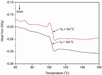 As the glass transition occurs over a temperature range, the midpoint temperature of the glass transition region (step change in specific heat capacity) in the second heating curve was selected to represent Tg. DSC analysis of EPS bead revealed a Tg of approximately 103°C with a good reproducibility (Figure 3). This result was in agreement with previous research by Shalbafan et al. (2012) that reported Tg of expandable polystyrene of 103°C.