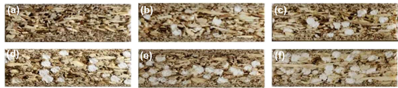 The internal section of the low-density particleboards is shown in Figure 4. In this study, the coarse particle was applied in the core layer, due to the large particles are expected to give better mechanical strength, while the fine particles were good for surface quality (Monteiro et al. 2018). It is clearly seen that with the increase of EPS bead content from 0 % to 12,5% in the core layer, more and more wood particles were surrounded by EPS bead, and the empty spaces between particles were decreased.