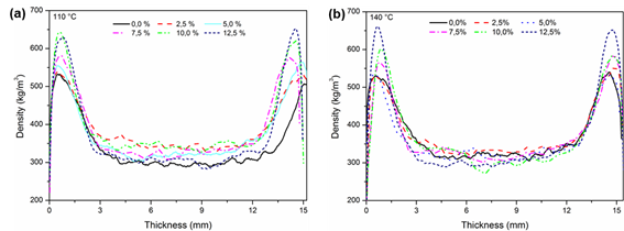 The mean density of all these particleboards is similar (Table 1). It is well-known that the density profile over the cross-section of the particleboard formed during hot pressing influences mechanical and physical properties of panels. Therefore, it is necessary to investigate the density gradient of the panels. The vertical density profile over the panel thickness generally resembles a U-shape, as shown in Figure 6. For both press temperature (110°C and 140°C), adding EPS bead to the core layer led to a more pronounced density gradient of the panel with higher face layer densities compared to the controls. The increase of EPS content in the core layer led to a higher face layer density. This effect was probably dueto the higher volume of core particles, causing increased counter pressure during compression and thus more compacted face layer. The maximum face layer density (about 650 kg/m3) appeared in panels with 10% and 12,5% EPS content, while the minimum face layer density (about 530 kg/m3) appeared in control panel without EPS bead as filler.