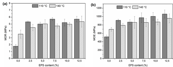 Comparing the two press temperatures, higher temperature (140 °C) was more favorable in reference panels without EPS as filler, because it is necessary to get a high enough temperature in the core to make sure the adequate curing of the adhesive. However, higher temperature had a negative effect on the bending properties of panels with addition of EPS filler, resulted in lower MOR and MOE compared to that of panels pressed at 110 °C. This is probably attributed to the shrinkage of EPS bead under press temperature that is far beyond than its glass transition region (100 ºC to110 °C).