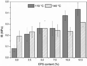 Compared with the control panel (0 % EPS content) pressed at 110 °C, higher press temperature (140 °C) resulted in a significant increase in IB strength value from 0,08 MPa to 0,19 MPa. However, in the case of panels with addition of EPS bead, higher press temperature had a negative effect on the IB strength, especially in high EPS contents (10 % and 12,5 %). This phenomenon is consistent with the previous study by Mir (2014) who found that increasing press temperature had a negative effect on IB of lightweight particleboard using EPS as filler.