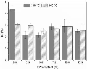 The thickness swelling after 2h of water soaking (Figure 9) was measured to determine the thickness change of the low-density particleboards. The highest TS (4,4%) was observed in panels pressed at 110°C without adding EPS bead, due to the voids between wood particles. Adding 2,5% content of EPS bead reduced the TS to 2,2%, because EPS has the hydrophobic characteristic with a closed cell structure. Additionally, hydrophobic EPS bead filled in the empty spaces in the core layer, which reduced thewater accessibility to the wood particles. However, there was no significant difference between TS of panels adding different contents of EPS from 2,5% to 12,5%. Compared with press temperature of 110°C, pressing at 140°C resulted in decreased TS (3,1%) for panels without adding EPS bead, whereas TS was increased in panels adding EPS bead.