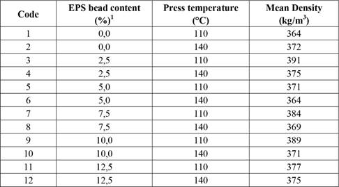 Three layered particleboards with a target density of 400 kg/m3 and thickness of 15 mm were manufactured. The face layer was made of fine wood particles (16% moisture content), while the core layer contained a mixture of air-dried coarse wood particles (8% moisture content) and different amounts of EPS. To obtain a more pronounced density profile, the fine wood particles used in the face layer were sprayed with required amount of deionized water and conditioned to reach 16 % moisture content. The pMDI and acetone were weighed out at a mass ratio of 4:1 into a beaker and then mechanically stirred for 10 s to obtain a homogeneous mixture. The adhesive content was 7% for core layer and 10% for face layer (based on the oven-dry mass). The code number and composition of the low-density particleboards and their mean density is shown in Table 1. The three-layer mat was made manually using a 340 mm×360 mm forming box, and then pressed at 110°C for 15 min or 140°C for 9 min at an initial pressure of 2 MPa. Then the press was set to distance mode, applying a variable pressure to maintain the desired panel thickness using thickness gauges. Panels without EPS beads were also manufactured at the two press temperatures as the controls. For each panel variable, according to Table 1, two replicates were manufactured.