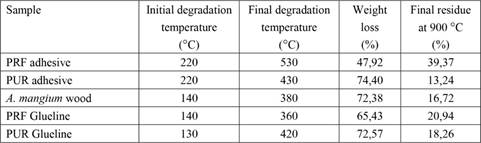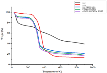 Heat resistance of a material is one of the most important criteria in any building construction. Since wood is combustible, the application of wood as building material becomes very limited. Thus, thermal evaluation is an essential method to determine the capability of the material to resist heat. In general, TGA is used to observe the material's thermal stability and degradation behaviour. TGA analysis on the neat adhesive (PRF and PUR), glue line between wood and the adhesive and A. mangium wood are demonstrated in Figure 1 and Table 1.