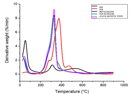 Derivative thermo-gravimetric (DTG) analysis of both PRF and PUR adhesives, A. mangium wood and glueline of both PRF and PUR are shown in Figure 2. DTG analysis is used to study the rate of degradation of the materials up to a certain temperature (Ridzuan et al. 2016). Three peaks were observed for all specimens which are below 100 °C, 280 °C to 380 °C and 420 °C to 520 °C. A low first degradation peak responsible for free water removal except for PRF adhesive glue. A maximum decomposition rate at 4,83 %/min for PRF was observed due to the presence of hydroxyl molecule in PRF adhesive glue (Asim et al. 2016). All specimens demonstrate the maximum rate of weight losses in the second peak except PRF adhesive glue. A. mangium wood showed a higher DTG value at the second peak among all the samples. Meanwhile, the application of adhesive glues (PRF and PUR) on A. mangium wood seems to reduce the rate of weight loss as part of the specimen’s mass replaced by higher thermal stability materials. No significant changes showed at the third region of DTG peaks for all samples.
