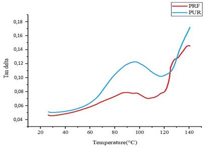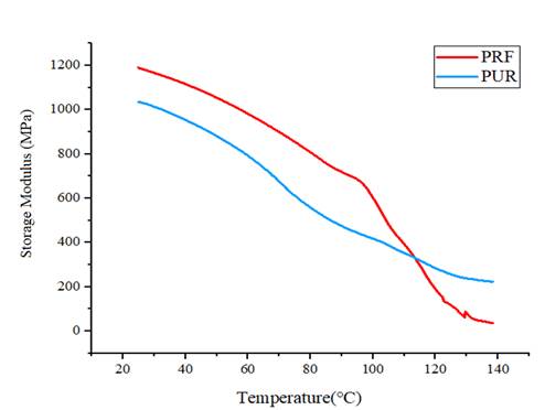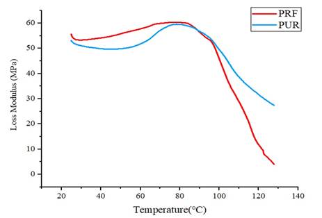 Meanwhile, the loss modulus measurement is carried out on the energy dissipation response under the reciprocate deformation of a material (Jawaid et al. 2012). The loss modulus of PRF and PUR adhesive glue line of CLT made by A. mangium wood are illustrated in Figure 4. Both curves at maximum value indicates maximum dissipation of mechanical energy at lower temperature and decreased dramatically at higher temperature due to the free movement of polymer (Saba et al. 2016b). From Figure 4, both glue lines demonstrated a wide peak at 60 °C to 100 °C and the Tg observed for PRF glue line is slightly lower than PUR glue line. This is because the inter-molecular friction in the PRF glue line was higher and increases the dissipation of energy within CLT (Hameed et al. 2007). PRF glue line resulted in a higher loss of modulus due to the increased amount of energy needed to disentangle a better interfacial bonding.