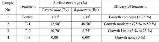 The results in term of surface coverage by test fungi i.e., T. versicolor and R. placenta over bamboo samples containing PDA medium are shown in Table 1 and Figure 2.
