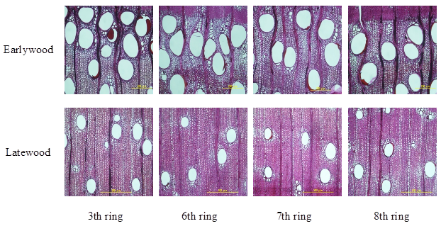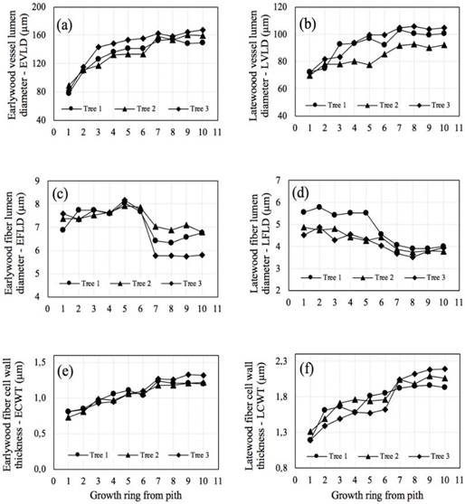 Images showing variation in vessels and fibers for rings of different ages are shown in Figure 1 and Figure 2 respectively, while radial patterns of variation in cell morphology from pith to bark in earlywood and latewood of M. azedarach planted in northern Vietnam are shown in Figure 3. Vessel lumen diameter of M. azedarach trees tended to rapidly increase up to 7th ring from the pith before becoming constant towards the bark both in earlywood and latewood (Figure 3a and Figure 3b). The EFLD and LFLD, on the contrary, showed increasing and decreasing trends respectively from pith to 6th ring before significantly decreasing and then remaining constant from 7th ring outwards (Figure 3c and Figure 3d). The radial pattern in ECWT and LCWT was similar to that of the vessel lumen diameter (Figure 3e and Figure 3f). The radial pattern of variation from pith to periphery of these anatomical properties has been reported for other ring-porous species. For M. dubia (up to age 5) observed trends for vessel diameter and fiber wall thickness were consistent with our findings, while fiber lumen width decreased (15,9 (m to 9,4 (m) (Saravanan et al. 2013). It should be noted that Saravanan et al. (2013) did not distinguish between earlywood and latewood, if our earlywood and latewood observations for fiber lumen width were averaged then a similar trend would be observed. In S. macrophylla, Anoop et al. (2014) indicated that the vessel diameter gradually increased from pith to bark, while fiber wall thickness increased from pith to a peak, and declined towards the periphery in the radial direction. Tsuchiya and Furukawa (2009b) found that vessel lumen diameter in earlywood increased in size for up to 20 years before stabilizing in the ring-porous hardwoods Acanthopanax sciadophylloides and Evodiopanax innovans.
