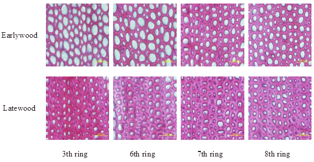 Radial variation of cell morphology was investigated by the method described by Ishiguri et al. (2012). Transverse sections (20 (m in thickness) were obtained from each ring with a sliding microtome. The sections were stained with safranin and then dehydrated and mounted in biolite (Wako Pure Chemical Industries, Ltd.). Digital images of transverse sections were taken using a digital camera (CAMEDIA C5050ZOOM, Olympus) attached to an optical microscope and analyzed with ImageJ software (National Institute of Heath 2012). For each ring earlywood vessel lumen diameter (EVLD), earlywood fiber lumen diameter (EFLD), and earlywood fiber cell wall thickness (ECWT) were measured on the first 5 rows of earlywood cells, while latewood vessel lumen diameter (LVLD), latewood fiber lumen diameter (LFLD), and latewood fiber cell wall thickness (LCWT) were measured on the outermost latewood cells. Average tangential and radial lumen diameters were determined by measuring 30 vessels and fibers in each ring. Double wall thickness of 30 fiber cells was measured, and one half of the double wall thickness was defined as the fiber wall thickness in each ring. Average tangential and radial fiber diameter was determined by summing average lumen diameter and wall thickness (( 2).