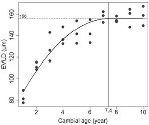 EVLD is one of the properties used to differentiate between juvenile and mature wood. EVLD generally shows an increase from pith to the bark, where EVLD is smaller near the pith, and gradually increases in size radially before leveling off in the outer part of the stem (Bhat et al. 2001, Tsuchiya and Furukawa 2009a, Tsuchiya and Furukawa 2009b) and as observed in Figure 3a and Figure 3b. To estimate EVLD maturation age in M. azedarach we used a segmented regression model with quadratic equation and a plateau. We found that EVLDs increased rapidly in the inner part of the stem, and these values tended to be unchanged with an estimated plateau of 156 (m from cambial age of 7,4 towards the periphery of the tree (Figure 4). The obtained result is comparable with those reported by Duong et al. (2017) showing that wood of M. azedarach beyond ring number 7 from pith had comparatively long fibers, high SG, and low MFA in the S2 layer of fiber cell walls. These findings suggest that wood of the M. azedarach could be classified into core wood and outer wood based on EVLD, and the boundary between core and outer wood may be located at 7th ring from pith. This should be taken into account in wood processing using M. azedarach grown in northern Vietnam. In other studies of plantation grown M. azedarach higher stocking rates have been employed, for example 2 m ( 2 m in Nasser et al. (2010) and spacing’s ranging from 1 m × 1 m to 3 m × 2 m in Leles et al. (2014). The influence of different planting densities on the maturation of M. azedarach is unknown and requires further investigation.