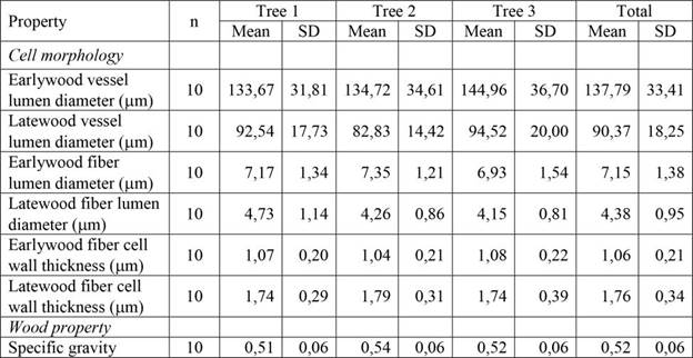 Descriptive statistics (means and standard deviations) in cell morphology and SG of the sampled M. azedarach trees planted in northern Vietnam are shown in Table 2. Average EVLD was 137,79 (m varying between trees from 133,67 (m to 144,96 (m; and average LVLD was 90,37 (m varying from 82,83 (m to 94,52 (m. Lumen diameter of earlywood fibers averaged 7,15 (m (range 6,93 (m to 7,35 (m) and 4,38 (m (range 4,15 (m to 4,73 (m) in latewood, while fiber wall thickness varied from 1,04 (m to 1,08 (m in earlywood and from 1,74 (m to 1,79 (m in latewood (Table 2). Palakit et al. (2018) reported vessel diameters for M. azedarach grown in northeastern Thailand that ranged from 120 (m to 210 (m but to the best of our knowledge, there have been no previous reports of lumen diameters of fibers, and fiber wall thickness. Thus, the present study experimentally documents these properties of M. azedarach for the first time. Anoop et al. (2014) reported the anatomical properties of S. macrophylla, and showed that the values of vessel diameter in earlywood, fiber lumen diameter and fiber wall thickness were 167,6 (m, 12,8 (m, and 1,9 (m, respectively, which are similar to what we report for M. azedarach.