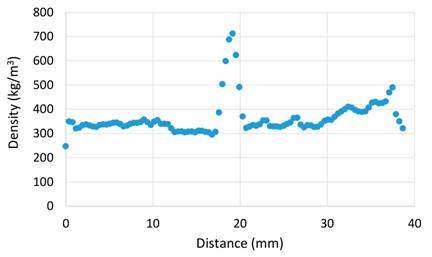 The average wood density of the poplar samples was about 368 kg/m3 while the maximum wood density in the welded bond was much higher at about 710 kg/m3 (Figure 3). It has been demonstrated with X-ray computed tomography (CT) scanning that the amount of densification is increased with the welding process and thus creates tighter bonds. CT scanning is seen as a versatile research method for studying weld-merged trees. Faster and more realistic results can be learned in a non-destructive way with this method.