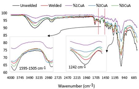 It is seen that as the impregnation concentration increased, the proportion of modified lignin decreased. Additionally, reductions in lignin ratio were observed with the welded procedure. In the sample impregnated with a concentration of 5% ACQ in the band belonging to 1242 cm-1, there was an increase in density due to internal bonding resistance in wood by bonding with lignin based on 1 % to 3% ACQ concentration. The welding process of wood to wood is based on the melting and flow of polymer material, mainly lignin, as well as hemicelluloses, which connect the amorphous cells in the wood structure (Pizzi et al. 2004).