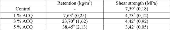 When the impregnation concentration increased, the amount of retention increased. The highest retention was found 38,45 (kg/m3) in 5% ACQ (Table2).