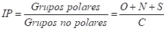 (2)Por otra parte, el IP se ha estudiado para distintos compuestos orgánicos (e. g. hemicelulosa, glucosa) a partir de la investigación de Rutherford et al. (1992) y utilizado en modelos matemáticos para HTC por Li et al. (2018) y Vallejo et al. (2020a). Este índice permite conocer la disponibilidad que tiene la biomasa para ser solubilizada por el medio acuoso en condiciones subcríticas (Vallejo et al. 2020a). La Ecuación 3 permite la determinación de IP, donde, O, N, S y C indican el contenido en peso de oxígeno, nitrógeno, azufre y carbono en la biomasa cruda. Si bien los estudios realizados por (Li et al. 2015, Li et al. 2018) no consideran el azufre, el estudio original de Rutherford et al. (1992), indica que el azufre se omite de la fórmula únicamente por su bajo contenido promedio en las muestras orgánicas que se estudiaron. Por tal motivo, en este trabajo se tomará en cuenta el contenido de azufre como constituyente de los grupos polares.