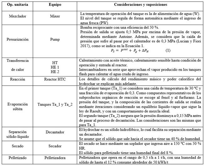 La descripción detallada de cada operación unitaria del proceso, así como las principales suposiciones y ecuaciones se indican en la Tabla 1.
