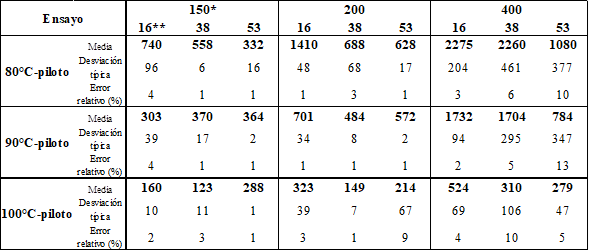 Al comparar los resultados industriales con las correlaciones por cada temperatura encontradas durante el ensayo piloto (Correlación Apilado), se observa que el tiempo de esterilización con vapor es generalmente sobreestimado por dichas correlaciones, el efecto es más notable a una temperatura de 100 °C (Tabla 5).