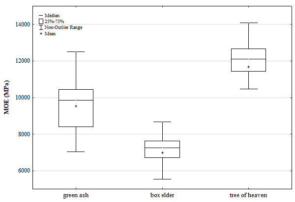 For MOE, the order is as follows (Figure 3): tree of heaven (11665 MPa), green ash (9546 MPa), and box elder (6989 MPa). The tree of heaven and box elder values do not differ significantly from those given by the literature (Meier 2015, Alden 1995). Green ash, on the other hand, has a value more than 15% higher than those reported. In terms of MOE, wood from tree of heaven and green ash is virtually equivalent to common ash, whereas the value of the box elder was more than 20% lower than Wagenführ (2007), Meier (2015), Hassan and Tippner (2019) reported.