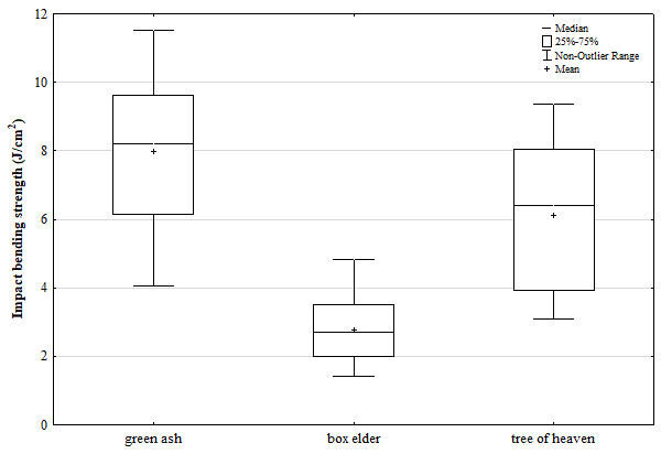 The tensile strength was determined for 2 species (Figure 5), which also had high variance values. Similar to impact bending strength, very few studies report this strength characteristic. The tensile value is 122,6 MPa for green ash and 71,3 MPa for box elder. Compared to Berki (2014) common ash value, green ash is about 25% lower.