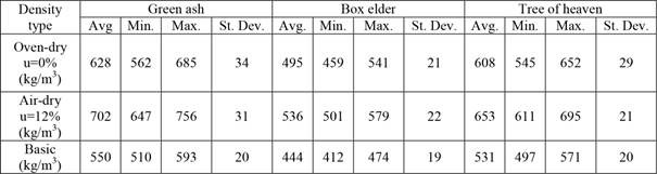 The average density values of the 3 tree species were distinct (Table 1). Regardless of the density type green ash had the highest density among the species followed by the tree of heaven then the box elder. It is worth to compare the values within the species with same genus and also which are more frequently used in the wood industry. Following this principle box elder was compared to sycamore (Acer pseudoplatanus), green ash was compared to common ash (Fraxinus excelsior) . As the tree of heaven's wood is most closely related to ash, common ash were chosen in its case too.