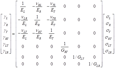 The use of US for determining elastic constants is based on the theory of solids and elastic wave propagation. The symmetry of wood is similar to an orthotropic crystal with orthogonal axes corresponding to the main directions of the tree (L-longitudinal, R-radial, and T-tangential). Twelve constants that completely characterize the elastic properties are related to Equation 1.