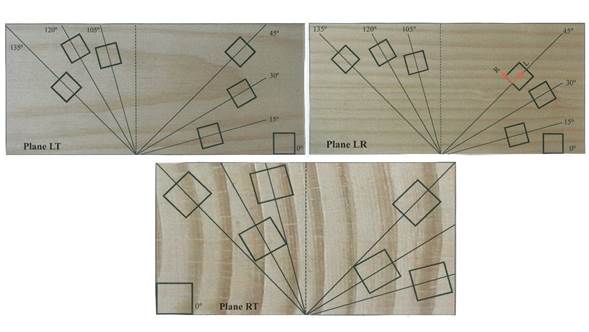 The cubes for the three planes, LR, LT, and RT, are shown in Figure 1. Elastic moduli and shear moduli were determined with the 0° orientation. Density was registered for each cube in Table 1.