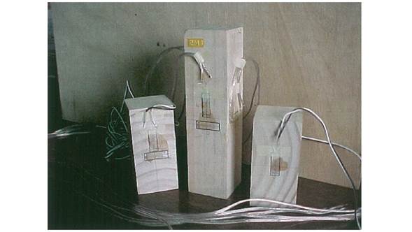 The load cycle was performed in a Universal Instron machine and the deformations at different loads were acquired with a data logger. To obtain both the elasticity moduli and Poisson ratio, the deformations were measured by strain gauge KL-10-120-A4 (Kyowa) placed in the wood sample according to the required strains, as shown in Figure 3. When the load was parallel-to-grain, i.e longitudinal direction, three strain gauges were placed in the sample. To obtain the elasticity moduli ELL, one of the said gauges was placed along the longitudinal direction, and for the Poisson’s ratio calculations νLR and νLT, the other two were placed along the radial and tangential directions, respectively. When the load was along the radial direction, only two strain gauges were placed in the sample. In this case, to obtain the elasticity moduli ERR one strain gauge was placed along the radial direction, and for Poisson’s ratio νRT the other was placed along the tangential direction. When the load was along the tangential direction, only one strain gauge was placed in the sample in this direction to determine the elasticity moduli ETT. Poisson’s ratios νTR and νTL were determined using symmetry properties.