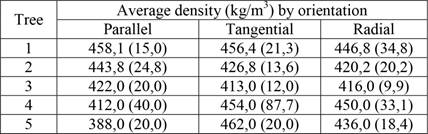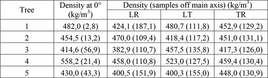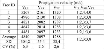 The average density of the samples shows a wide range (415 kg/m3 to 558 kg/m3), mainly due to varying proportions of earlywood or latewood and juvenile and mature wood in the samples, as was expected. This parameter strongly influences ultrasound velocity (Equation 2).