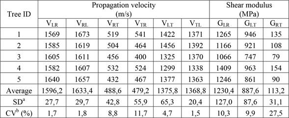 The shear modulus obtained by the ultrasound technique using a shear polarization transducer is shown in Table 3. As expected, similar symmetry in propagation velocity was observed. Because of this symmetry, the average values for this modulus were 1230,4 MPa for the LR plane; 887,6 MPa for the LT plane, and 113,2 MPa for the RT plane. The relationship between them (LR:LT:RT) was 11:7,9:1; which is consistent with the literature for wood (Bodig and Jayne 1993).