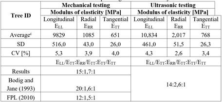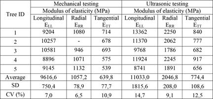 The mechanical and ultrasound testing showed more similar values for the elastic moduli (ELL) along the longitudinal direction than along tangential and radial directions. For example, the elastic modulus along the radial direction presented approximately twice the values using ultrasound in comparison to the modulus calculated by the mean of mechanical testing.