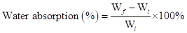 The water absorptions and WREs of all specimens were calculated using Equation 2 and Equation 3 respectively.