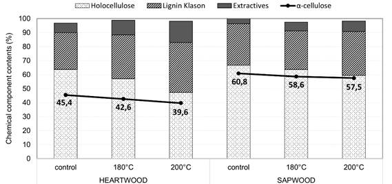 The untreated heartwood had higher extractive and Klason lignin contents than those of untreated sapwood, which exhibited higher holocellulose and α-cellulose contents.
