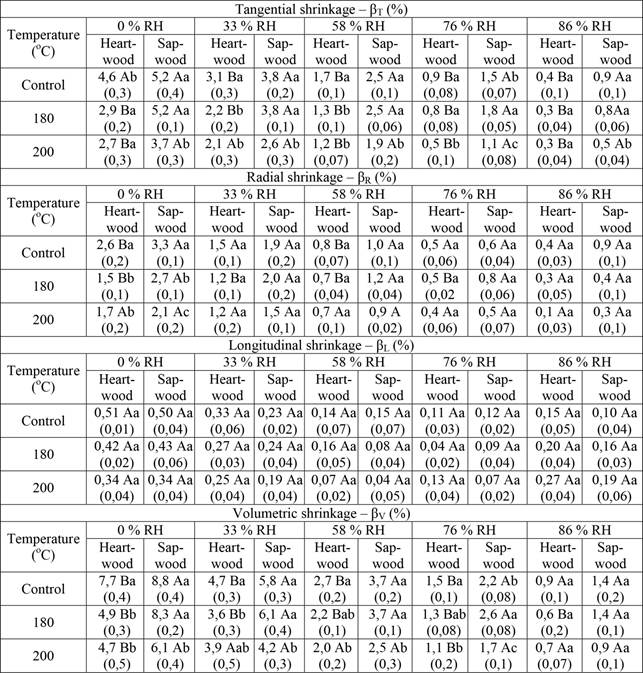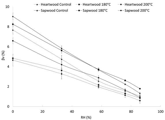 The ANOVAs showed a significant effect of the wood type and the thermal treatment on the linear (except for βL) and volumetric shrinkages for almost all moisture sorption conditions. The wood type showed a more important effect on partial and total shrinkages compared to the temperature treatment (Table 5). The thermal treatment decreased partial shrinkage in both heartwood and sapwood, however, this effect would be more important in sapwood (Table 7, Figure 3). Total linear and volumetric shrinkages also decreased with the thermal treatments for both wood types but this effect would be more important in heartwood (Table 7). At 200 ºC, the βT of the heartwood and sapwood decreased respectively by 41 % and 29 %, βR decreased by 35 % and 36 % and βV decreased by 39 % and 31 %, compared to untreated woods.
